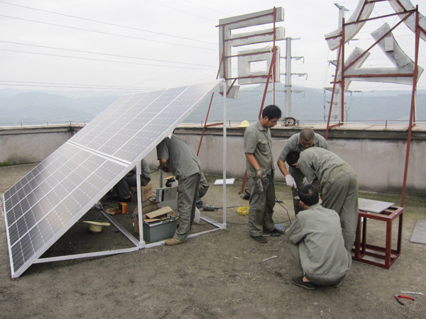 本網(wǎng)訊 日前,蘭花太陽能在銷售單晶硅圓棒、硅片基礎(chǔ)上不斷拓寬銷售渠道,積極探索太陽能路燈、太陽能屋頂小型發(fā)電站等銷售項目。圖為該公司員工正在辦公樓安裝自行設(shè)計的小型太陽能屋頂電站。(作者:常文軍)