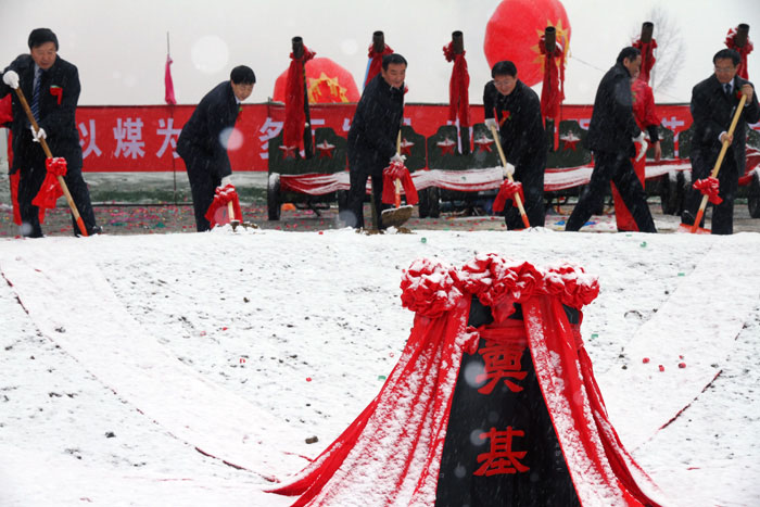 參加奠基儀式的領(lǐng)導(dǎo)共同為同寶煤業(yè)年產(chǎn)90萬(wàn)噸礦井建設(shè)項(xiàng)目奠基培土。
