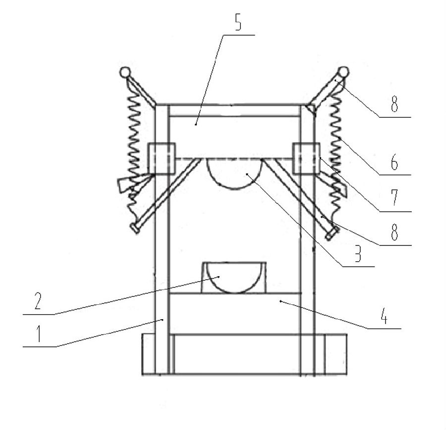 立體架1頂部和凸模座5上各固定連接有連桿8,彈簧6的兩端分別連接上述兩處的連桿8。在立體架1頂部的Φ16鐵管的端部以及凸模座5上分別固定向外側(cè)傾斜延伸的Φ14圓鋼作為連桿8,連桿8的傾斜角度為45°,彈簧6連接在兩個(gè)連桿8的外端部。