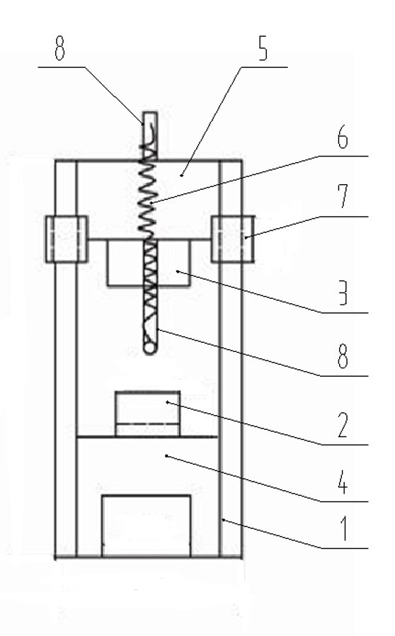 圖中:1-立體架,2-凹模,3-凸模,4-凹模座,5-凸模座,6-彈簧,7-滑動(dòng)套,8-連桿。