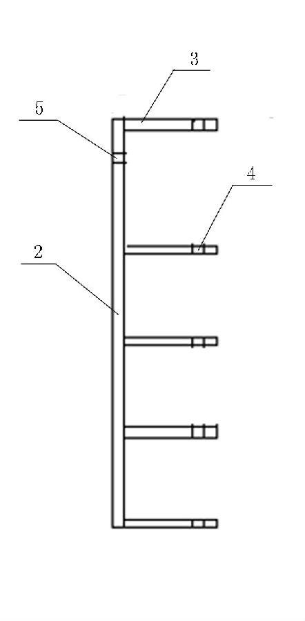 基板2采用寬70mm、厚5mm的扁鋼,基板2的長度可根據(jù)實(shí)際需要進(jìn)行設(shè)置,本實(shí)用新型優(yōu)選基板2長度為330mm。隔板1采用長100mm、寬70mm、厚5mm 的鋼板垂直焊接于基板2表面,最頂端隔板與第二隔板的間距為90mm,其余隔板的間距為60mm。插銷1可以穿過所有隔板1上的插銷孔4,將電纜限制于格狀空間內(nèi),保證電纜不會(huì)掉落,插銷1長度為360mm。