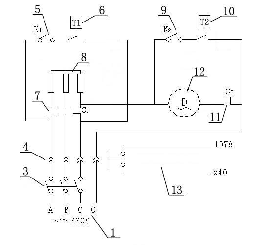 圖中:1-三相四線外接電源、2-電纜線、3-空氣斷路器、4-三相四線制專用插座、5-第一控制電路開關(guān)、6-第一水溫繼電器、7-第一交流接觸器、8-電加熱器、9-第二控制電路開關(guān)、10-第二水溫繼電器、11-第二交流接觸器、12-水泵、13-PC機(jī)柴油機(jī)加載保護(hù)電路。