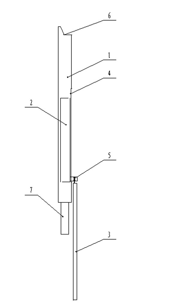 本實(shí)用新型所述的一種頂板錨固劑安裝器,包括安裝槽1、頂桿2和操縱桿3,所述的安裝槽1側(cè)面開有推拉槽4,頂桿2裝入安裝槽1內(nèi)部,頂桿2底部側(cè)面裝有從推拉槽4穿出的連接銷5,操縱桿3在安裝槽1外部并與連接銷5連接,安裝槽1頂部開有切口6。其中,安裝槽頂部切口6截面為梯形,安裝槽側(cè)面推拉槽4為長方形。