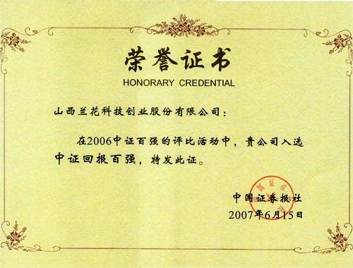 日前,由證券時報社、中聯(lián)集團聯(lián)合主辦的“2006年度中國上市公司價值百強”結(jié)果揭曉。晉城市唯一的上市公司--山西蘭花科技創(chuàng)業(yè)股份有限公司,繼4月份以第三位的成績榮獲“中國漂亮50”后,又獲得了中國上市公司價值百強的第三十二名,其中業(yè)績評價獲第十一名。