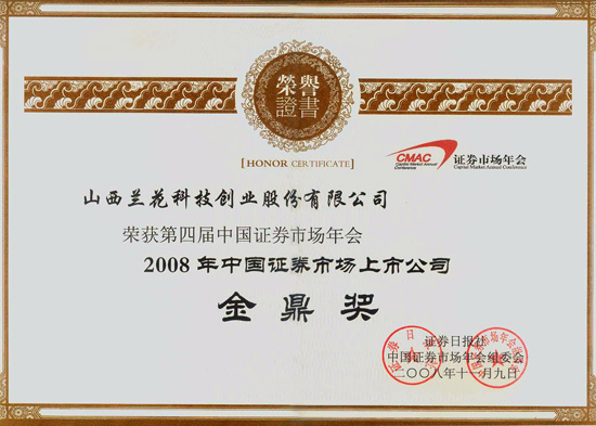 本網(wǎng)訊 在剛剛結(jié)束的“第四屆中國(guó)證券市場(chǎng)年會(huì)”上,蘭花科創(chuàng)以一流的經(jīng)營(yíng)業(yè)績(jī)、良好的社會(huì)形象和廣受贊譽(yù)的社會(huì)責(zé)任感,榮獲年會(huì)組委會(huì)授予的藍(lán)籌上市公司“金鼎獎(jiǎng)”,成為全國(guó)獲此殊榮的十家上市公司之一,這是繼去年西山煤電之后我省第二家獲此殊榮的企業(yè)。