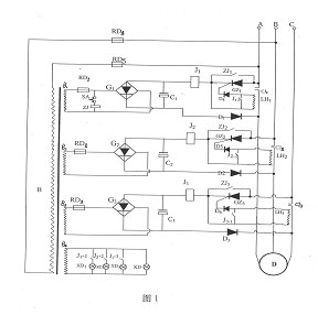 以負載為電動機為例說明該檢測裝置的工作原理,使用時,通過殼體上的接線端子與三相電源連接,控制變壓器B得電,信號燈XD發(fā)亮,控制變壓器B的次級端B1,B2,B3所在的直流回路處于開路狀態(tài)。(1)當真空管CJ1,CJ2,CJ3閉合時,電動機D啟動,由于起動電流很大,電流互感器LH1,LH2,LH3在正半周直接觸發(fā)可控硅GZ1,GZ2,GZ3導通,這樣,橋式整流塊G1,G2,G3、二級管D1,D2,D3、真空管CJ1,CJ2,CJ3、可控硅GZ1,GZ2,GZ3以及繼電器J1,J2,J3所構(gòu)成的回路導通,繼電器J1,J2,J3有電吸合,其常開觸點J1-1,J2-1,J3-1閉合,使電流互感器LH1,LH2,LH3處于短接狀態(tài),繼電器J1,J2,J3的常開觸點J1-2,J2-2,J3-2閉合,則紅燈、綠燈、黃燈均亮,表明真空管A、B、C三相都接通;如果三盞燈均不亮,證明真空管處于開路狀態(tài),電動機D停止工作;如果其中有一盞燈不亮,則說明由于真空管動靜觸頭不接觸而造成設備的缺相,燒壞電機。(2)當電機停止后,真空管CJ1,CJ2,CJ3斷開,可空硅GZ1,GZ2,GZ3因失去正向偏置而關(guān)斷,繼電器J1,J2,J3失電釋放,其常開觸點J1-1,J2-1,J3-1打開,電流互感器LH1,LH2,LH3又回到觸發(fā)狀態(tài),常開觸點J1-2,J2-2,J3-2打開,則紅燈、綠燈、黃燈均不亮;如真空管CJ1,CJ2,CJ3斷不開,仍處于閉合狀態(tài),則紅燈、綠燈、黃燈均亮,這說明真空管間隙為零,應停電調(diào)整真空管間隙并檢查,但不能在負荷側(cè)進行檢修以防觸電。從而可直接判斷真空管的接觸程度,便于正常維護。