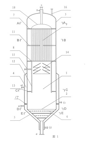 使用本熔硫釜工作時,來自脫硫系統(tǒng)的硫泡沫通過泵經(jīng)熔硫釜硫泡沫口g進(jìn)入釜內(nèi)經(jīng)上花盤7上的布液孔到換熱器,并經(jīng)折流板11折流后實現(xiàn)充分換熱后,經(jīng)下花盤8上的布液孔到分離區(qū)段夾套4和夾筒12之間的空間,被夾套4內(nèi)的蒸汽均勻加熱到70—80℃,進(jìn)入釜內(nèi)分離區(qū)1,硫顆粒聚集變大沉于釜的下部,在熔硫區(qū)夾套5和輔助加熱管6的作用下,熔硫區(qū)快速達(dá)到并保持在120—130℃,使沉于釜下的硫顆粒迅速熔融為液態(tài)硫,當(dāng)積累到一定量時開始開放硫閥d放硫自模錠回收。初步分離后的溶液經(jīng)三層喇叭狀筒體斜管14上升至靜液區(qū)(不加熱段),迅速使液硫進(jìn)行二次分離,致使未來得及沉淀的硫顆粒進(jìn)一步得到分離,確?;厥杖芤嘿|(zhì)量。然后分離好的液體進(jìn)入換熱器管內(nèi)被吸收顯熱后經(jīng)排液管a回收利用。來自鍋爐的蒸汽分別經(jīng)進(jìn)汽口e1、e2進(jìn)入夾套4、夾套5和輔助換熱管釋放顯熱(潛熱)后變?yōu)槔淠航?jīng)出口C1、C2流出回收。通過調(diào)節(jié)安全閥16可防止設(shè)備超壓,在測溫管15處可測量分離區(qū)的溫度,用于控制液體在分離區(qū)的溫度。