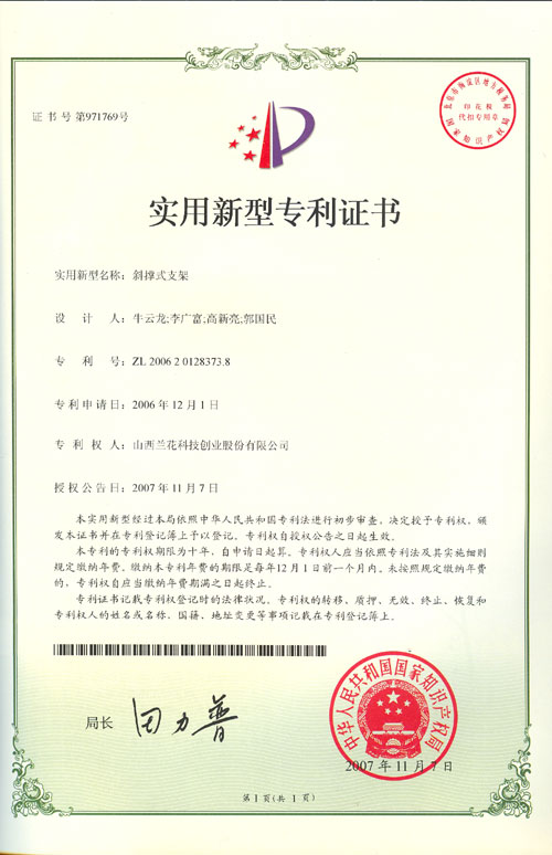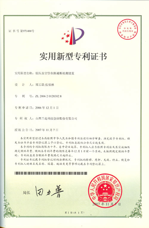 公司于2006年12月1日申請(qǐng)的兩項(xiàng)實(shí)用新型專利 “低壓真空管在路通斷檢測(cè)裝置”和“斜撐式支架”于2007年11月7日通過國家知識(shí)產(chǎn)權(quán)局初步審查,被授予專利證書。目前公司已擁有四項(xiàng)專利。